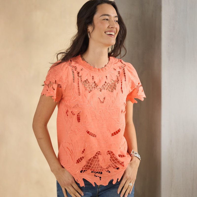Tonal openwork details grace this easy lace top. Keyhole at the back. Camisole included. Cotton. Hand wash. Imported. Exclusive. Sizes XS (0–2). S (4–6). M (8–10). L (12–14). XL (16–18). XXL (20–22). Approx. 24.5l.