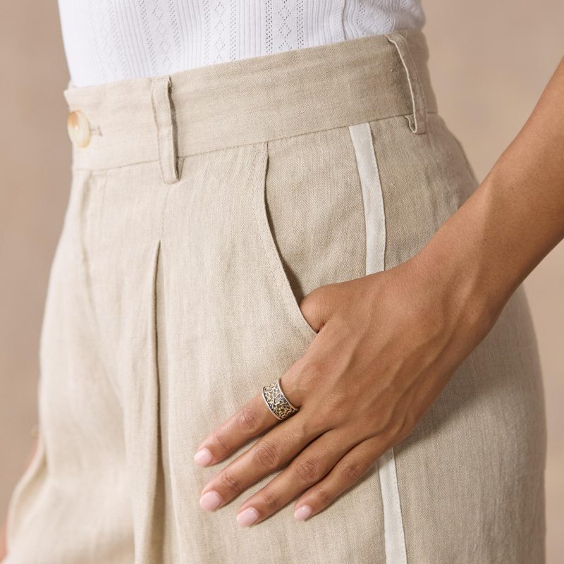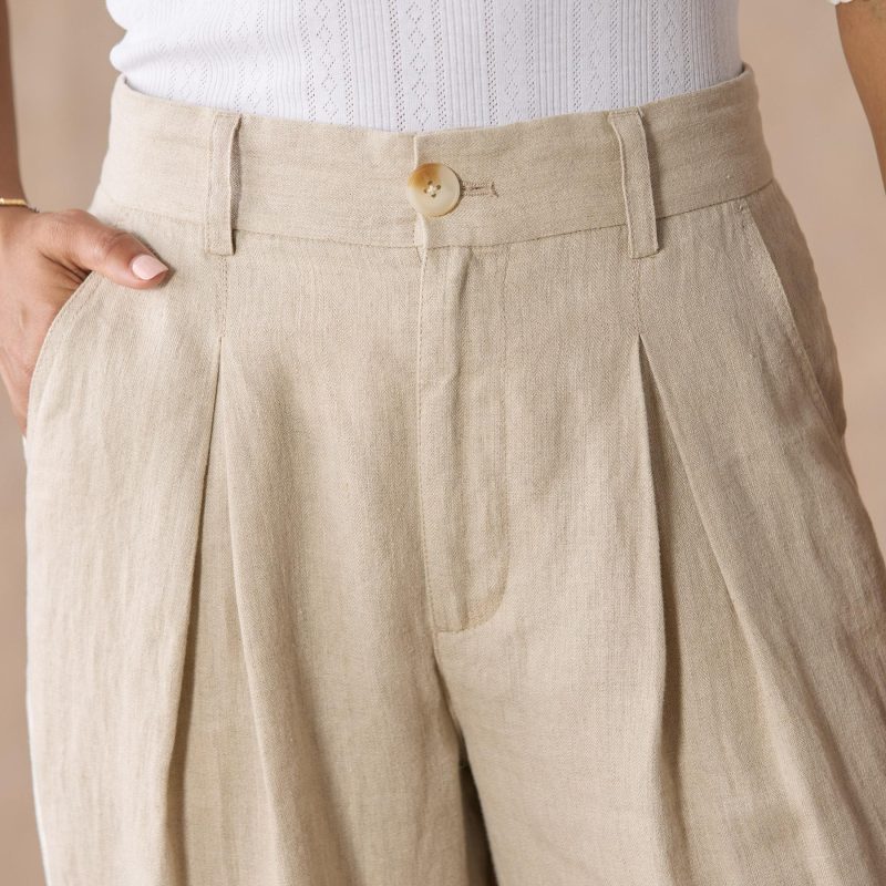 Our pleated linen trousers offer the most simply sophisticated silhouette. with wide-leg styling. side stripes and four pockets. Machine wash. Imported. Exclusive. Sizes 2?C16. 31 inseam.