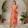 Angled. fluttery ruffles cascade down this beautiful print dress with deep side slit. smocked neckline. Fully lined. keyhole button back. Viscose. Machine wash. Imported. Exclusive. Sizes XS (0 to 2). S (4 to 6). M (8 to 10). L (12 to 14). XL (16 to 18). XXL (20 to 22). Approx. 49-1/2L.