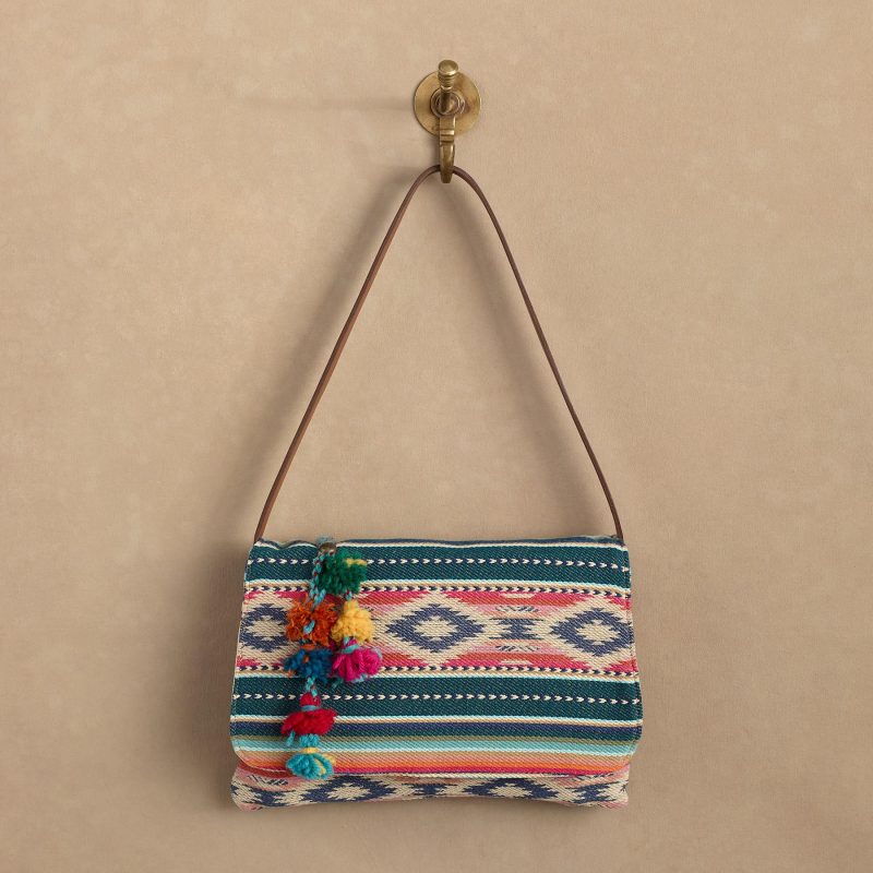 This handcrafted. geometric woven shoulder bag features a contrasting inner flap. pom tassel. magnetic closure. two slot pockets and one zipper pocket. Cotton. Made in USA. Approx. 11w x 1.5d x 7h.