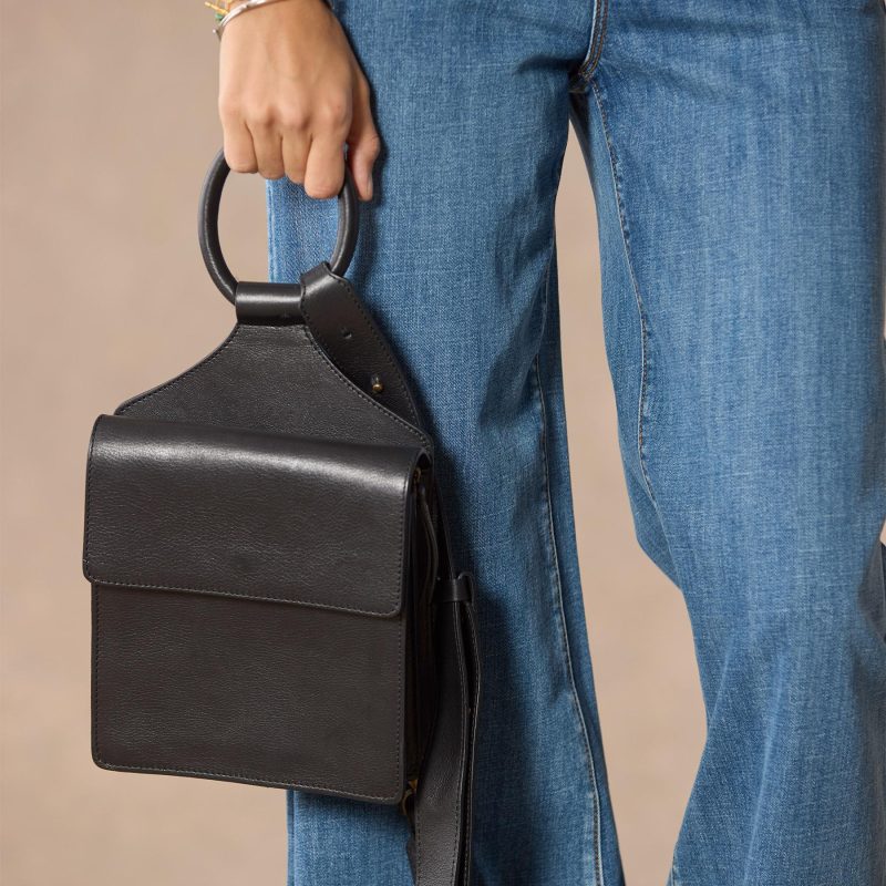 A striking ring handle draws attention to this sleek little bag. which includes a magnetic closure. zip pocket and a removable crossbody strap that can attach to either side. Leather. Italy. Exclusive. Approx. 9w x 3d x 12h.