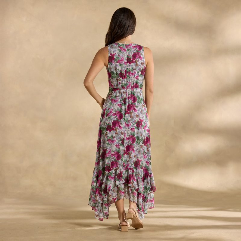 Equal parts outgoing and demure. our Champs de Fleur Printed Dress cultivates charm at every turn??with a flattering surplice neckline. subtle smocking and an ultra-femme asymmetrical ruffled hem. Back zipper with elastic for comfort; fully lined. Viscose/rayon. Machine wash. Imported. Exclusive. Sizes 2?C16. Approx. 56l.