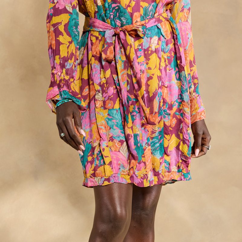 This lovely transitional piece deftly straddles the seasons with long sleeves and a feather-light. plant-based chiffon fabric in an earthy floral print. Functional shell buttons. ruffled elastic sleeve. removable belt and printed separate slip. Hits at knee. Cupro. Hand wash. Imported. Exclusive. Sizes XS (0-2). S (4-6). M (8-10). L (12-14). XL (16-18). XXL (20-22). Approx. 38l.