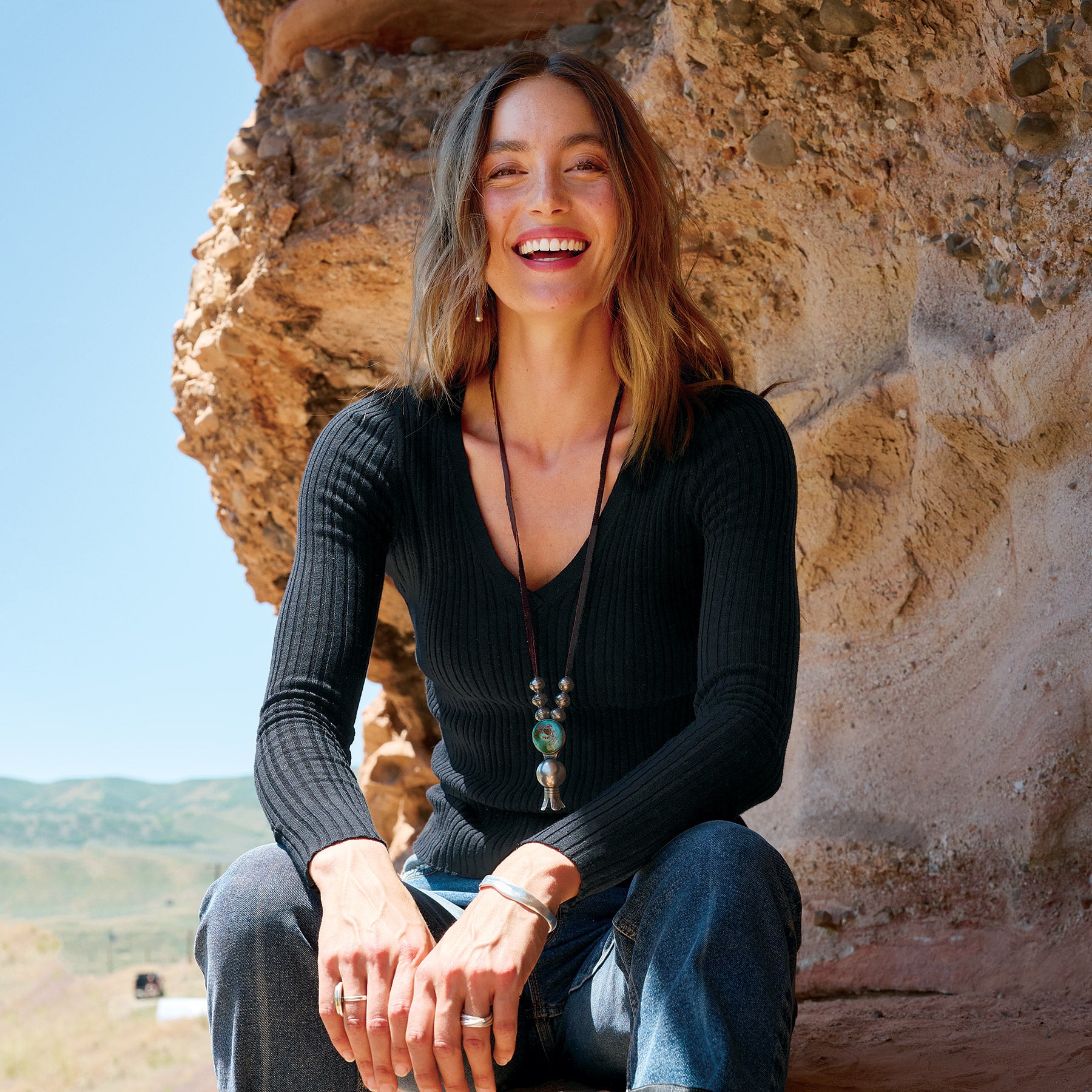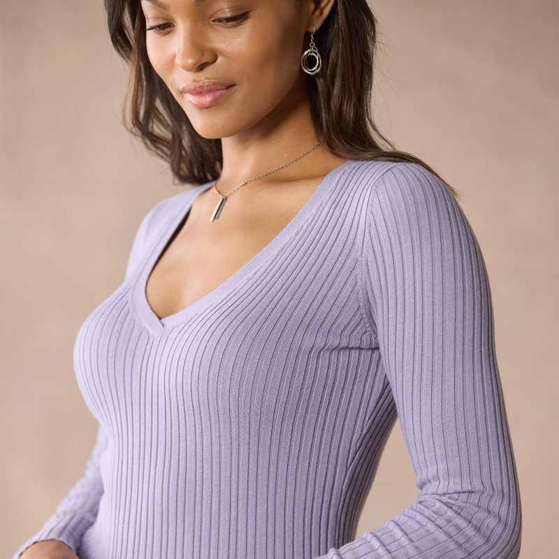 Simple and sophisticated. our fitted. mixed rib stitch sweater. in Lightest Legends yarn. V-neck. Cotton/nylon/spandex. Machine wash. Imported. Exclusive. Sizes XS (0–2). S (4–6). M (8–10). L (12–14). XL (16–18). XXL (20–22). Approx. 24l.