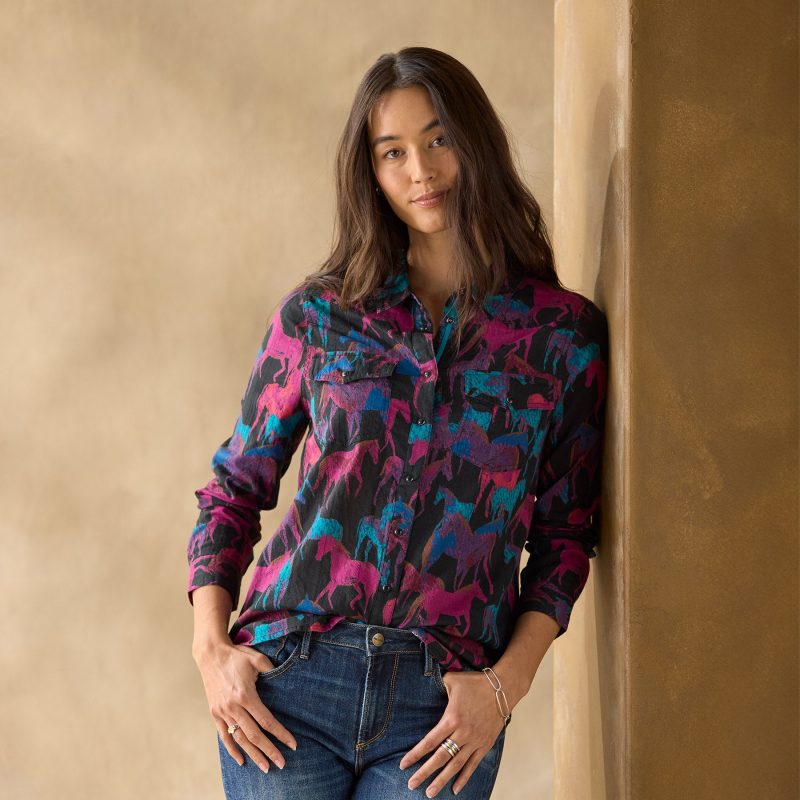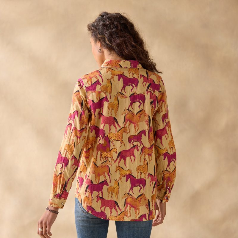 Western-inspired. pearlized snap front shirt in the prettiest cotton dobby with equestrian print. Two chest pockets. lace detail at back neck. grosgrain ribbon at placket. Western back yoke and shirttail hem. Machine wash. Imported. Exclusive. Sizes XS (0–2). S (4–6). M (8–10). L (12–14). XL (16–18). XXL (20–22). Approx. 27l.