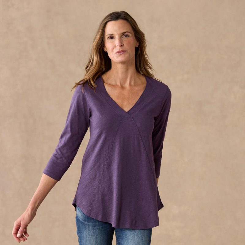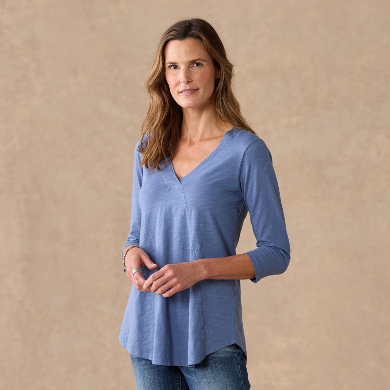 A Sundance favorite tee. now in three-quarter sleeve style. Comfy every day. this essential tee boasts subtle. directional seaming that flatters. V-neck and rounded hem. Cotton. Machine wash. Imported. Sundance exclusive. Sizes XS (0–2). S (4–6). M (8–10). L (12–14). XL (16–18). XXL (20–22). Approx. 29.75l.