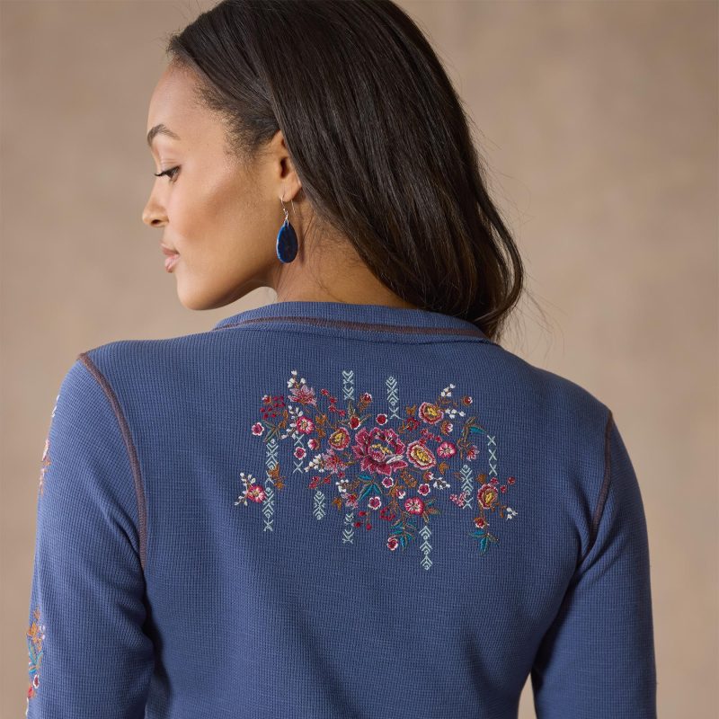 Lovely. multicolored floral and geometric embroidery graces our fitted. notch neck henley with contrast stitching detail. rib trim and princess seams. Metal buttons. Cotton. Machine wash. Imported. Exclusive. Sizes XS (0–2). S (4–6). M (8–10). L (12–14). XL (16–18). XXL (20-22). Approx. 26l.
