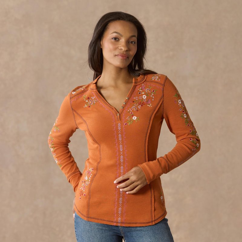 Lovely. multicolored floral and geometric embroidery graces our fitted. notch neck henley with contrast stitching detail. rib trim and princess seams. Metal buttons. Cotton. Machine wash. Imported. Exclusive. Sizes XXS (00). XS (0–2). S (4–6). M (8–10). L (12–14). XL (16–18). Approx. 24l.