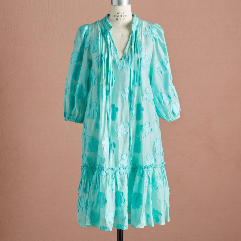 Make a statement in our stunning. easy popover jacquard dress with notch neckline and lovely ruffle detail. pintucking at the center front for a feminine touch and puff sleeves with encased elastic cuffs. Ruffle tiered hem. Cotton/Viscose/Nylon. Machine wash. Imported. Exclusive. Sizes XS (0-2). S (4-6). M (8-10). L (12-14). XL (16-18). XXL (20-22). Approx. 38l.