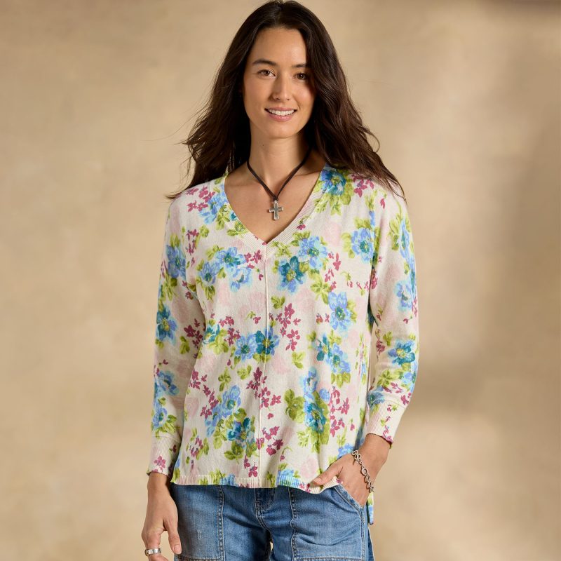 An update to an absolute Sundance favorite now in beautifully abstract florals. our lightweight. faded sweater is reverse-printed with exposed seaming. side slits and rib trim. Three-quarter sleeves. Cotton. Hand wash. Imported. Exclusive. Sizes XXS (00). XS (0–2). S (4–6). M (8–10). L (12–14). XL (16–18). Approx. 21l.