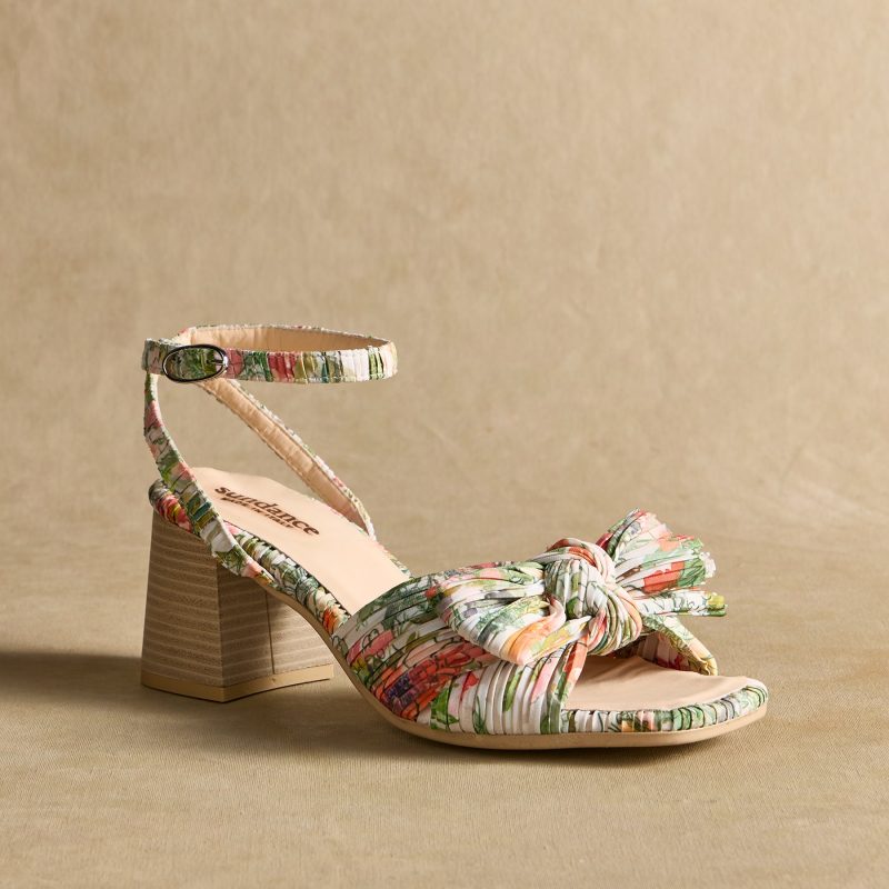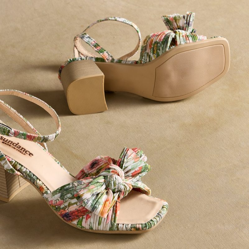All-over pleated fabric and an oversized bow are the highlights of these charming sandals. Adjustable ankle strap. leather insole. Polyester. Italy. Exclusive. Whole sizes 36-42. 36 (US 6). 37 (US 7). 38 (US 8). 39 (US 8.5). 40 (US 9). 41 (US 10). 42 (US 11).