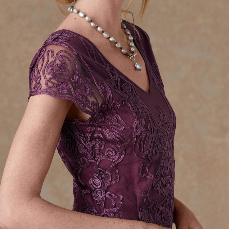 Easy. fit and flare. embroidered soutache mesh dress. with cap sleeves. scalloped hem and sleeves and a flattering. soft V-neckline. Pull-on styling. Lined. Nylon. Dry clean. Imported. Exclusive. Sizes XXS (00). XS (0-2). S (4-6). M (8-10). L (12-14). XL (16-18). Approx. 41l.