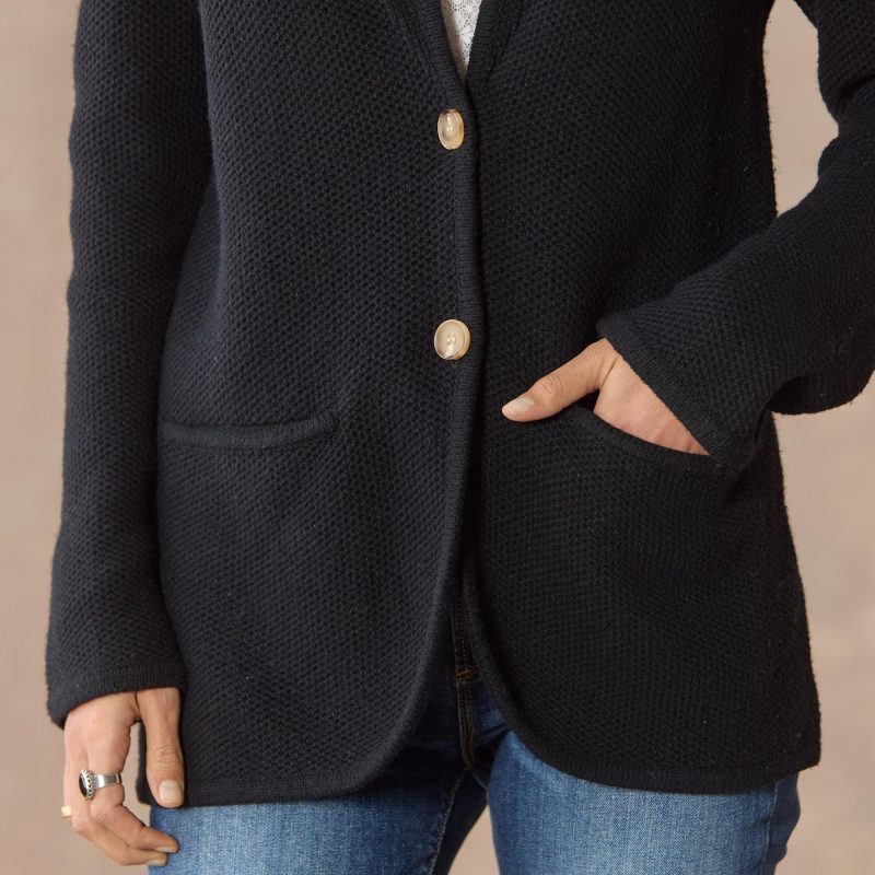 A new classic. our honeycomb stitch sweater blazer. Delightfully textural. with lapel collar. tubular details at cuffs and hem. faux horn buttons. two front pockets. Three-button cuffs. Cotton/nylon/wool. Hand wash. Imported. Exclusive. Sizes XXS (00). XS (0–2). S (4–6). M (8–10). L (12–14). XL (16–18). Approx. 25.5l.