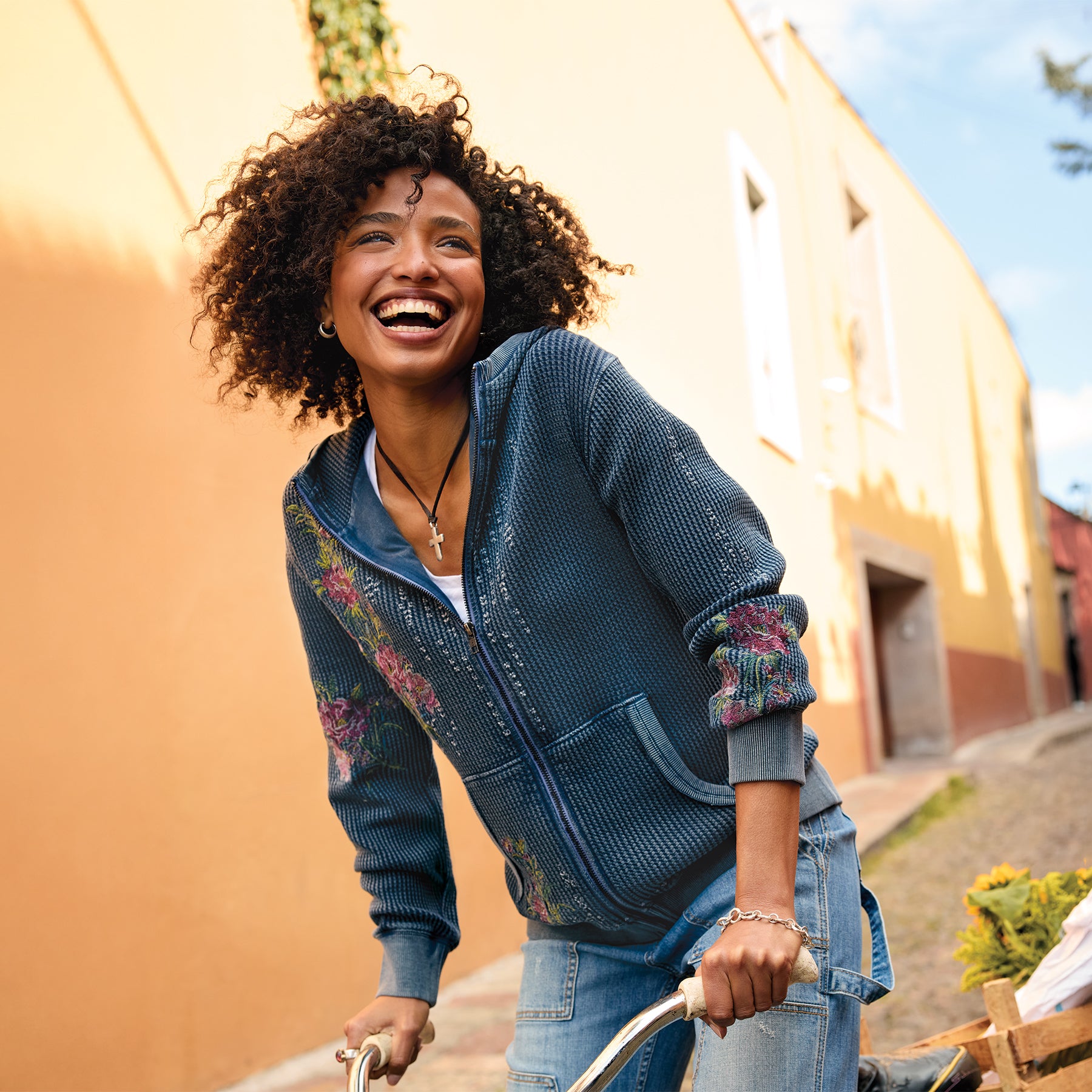 Softest waffle knit hoodie in a cool vintage wash adorned with floral and geometric embroidery. Full front zipper. kangaroo pocket. rib trim. Cotton. Machine wash. Imported. Exclusive. Sizes XXS (00). XS (0-2). S (4-6). M (8-10). L (12-14). XL (16-18). Approx. 24.5l.
