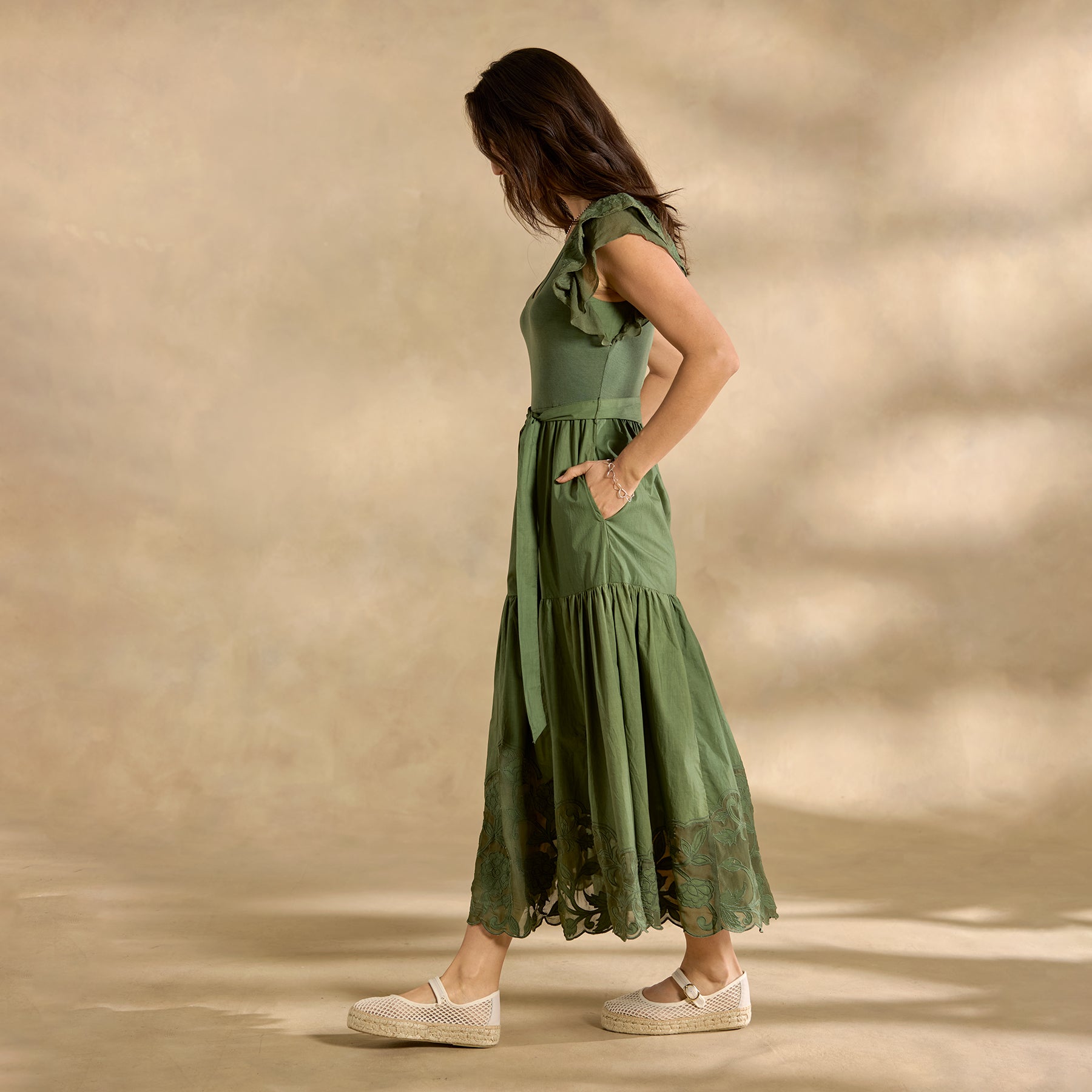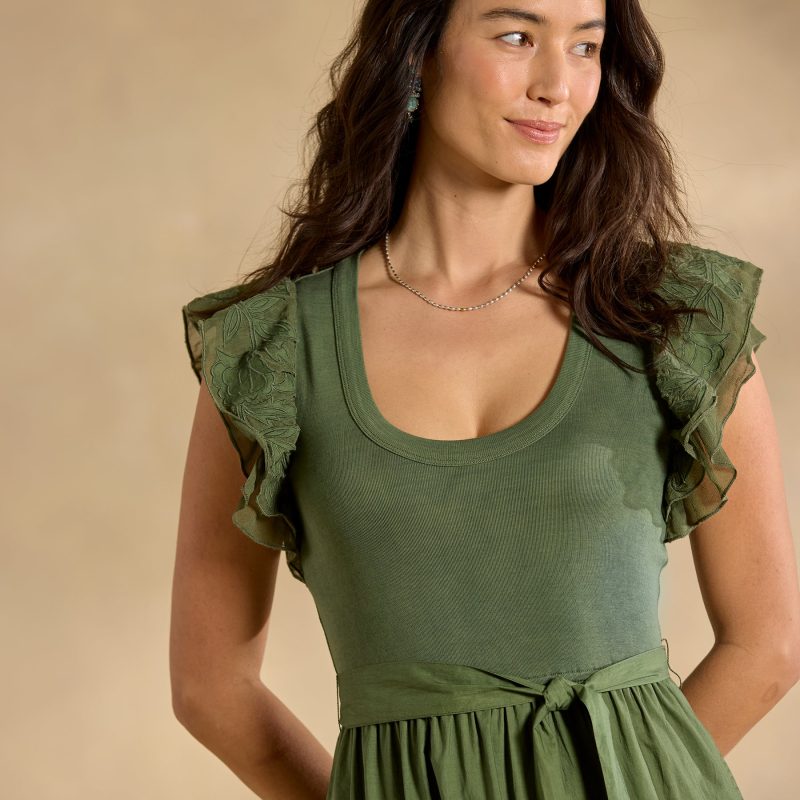 The intricate tonal detail that defines our mixed-media Madera Dress demands a closer look! With a rib-knit bodice. poplin skirt and delicate chiffon cutout details throughout??plus ruffled sleeves. scoop neck. elastic waist and lined skirt. Cotton. Machine wash. Imported. Exclusive. Sizes XS (0-2). S (4-6). M (8-10). L (12-14). XL (16-18). XXL (20-22). Approx. 49l.