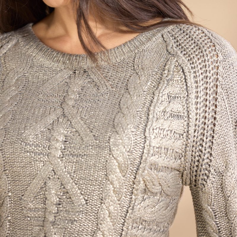 Our foil print crewneck sweater exudes a slight shimmer that is so festive. In a chunky cable mix. with exposed seam details. jersey roll at cuffs and rib trim. Cotton/nylon/merino wool. Hand wash. Imported. Exclusive. Sizes XS (0?C2). S (4?C6). M (8?C10). L (12?C14). XL (16?C18). XXL (20?C22). Approx. 22l.