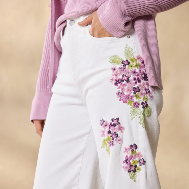 The breeziest wide-leg pants. artfully embellished with beautiful embroidery. Five-pocket styling. Cotton/polyester/spandex. Machine wash. Imported. Sundance exclusive. Sizes 24?C32. 30. 32 or 34 inseam; 11 rise; 26 leg opening.