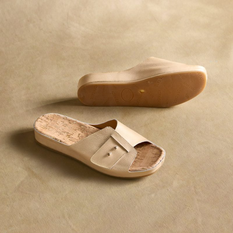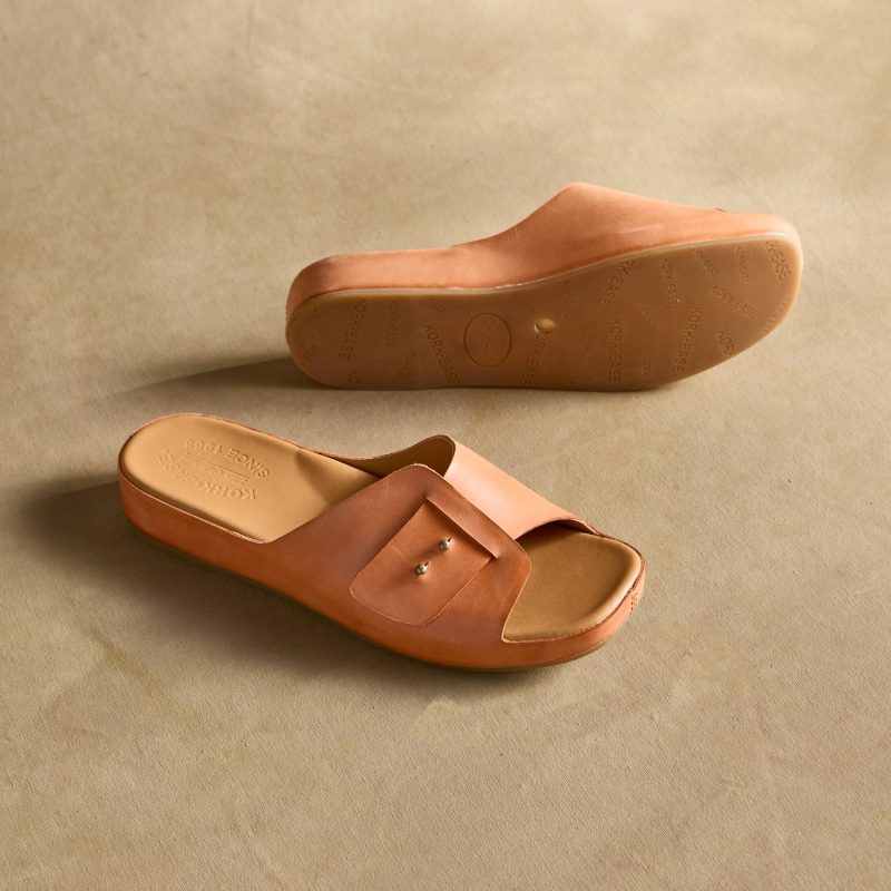 Go in comfort and style in these vegetable-tanned leather sandals with unique slip-through design straps and metal stud accents. Cork or rubber socks. rubber soles. Handcrafted. Imported. Whole sizes 6?C11. 1 heel.