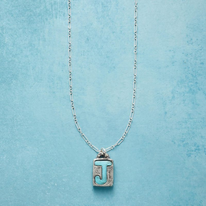 Jes MaHarry adds her personal touch. setting a hand-cut turquoise initial into a rustic bezel etched with joy on the side. love life on reverse. Sterling silver chain; Spring ring clasp. Exclusive. Handmade in the USA. Specify letter. 18l; pendant approx. 7/8l.
