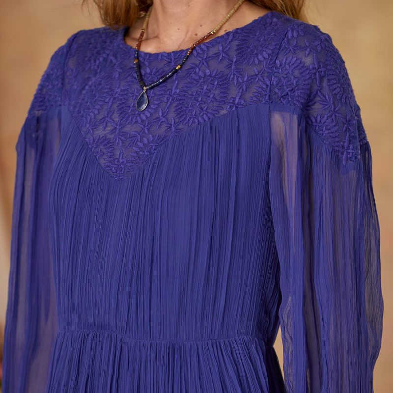 A vintage silhouette is updated in vibrant crinkle chiffon with embroidered mesh neckline. asymmetrical ruffle and elastic ruffle sleeves. Fully lined. keyhole button back. Viscose. Hand wash. Imported. Sizes XS (0-2). S (4-6). M (8-10). L (12-14). XL (16-18). XXL (20-22). Approx. 48l.