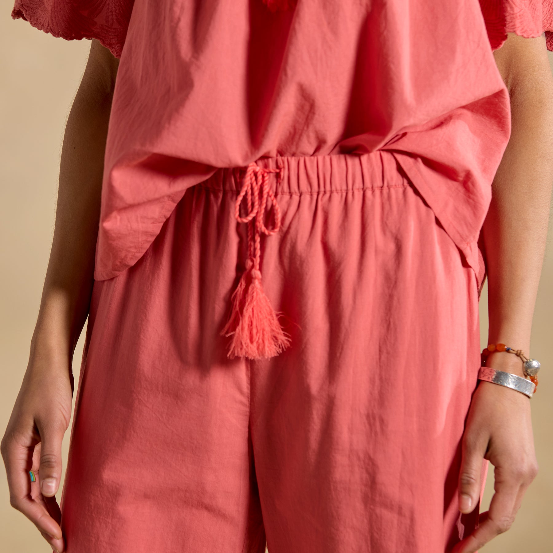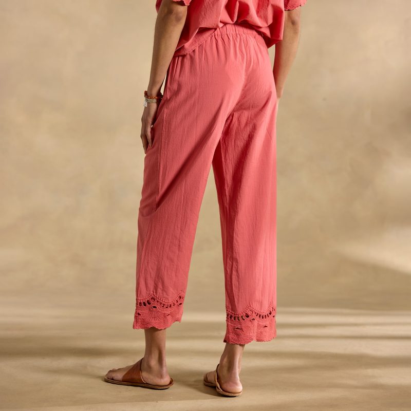 Easy. breezy cropped pants embellished with cut-out detailing and embroidery at hem. Smocked. elastic waistband with braided ties. Cotton. Machine wash. Imported. Sizes XS (4). S (6). M (8–10). L (12). XL (14). XXL (16). 26 inseam.