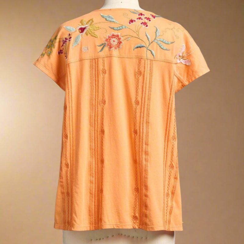 Beautiful floral and geometric embroidery flutters across the front and back of this easy-fit. notch neck top with cap sleeves and side slits. Cotton. Machine wash. Imported. Sizes XXS (2). XS (4). S (6). M (8-10). L (12). XL (14). Approx. 24.25l.
