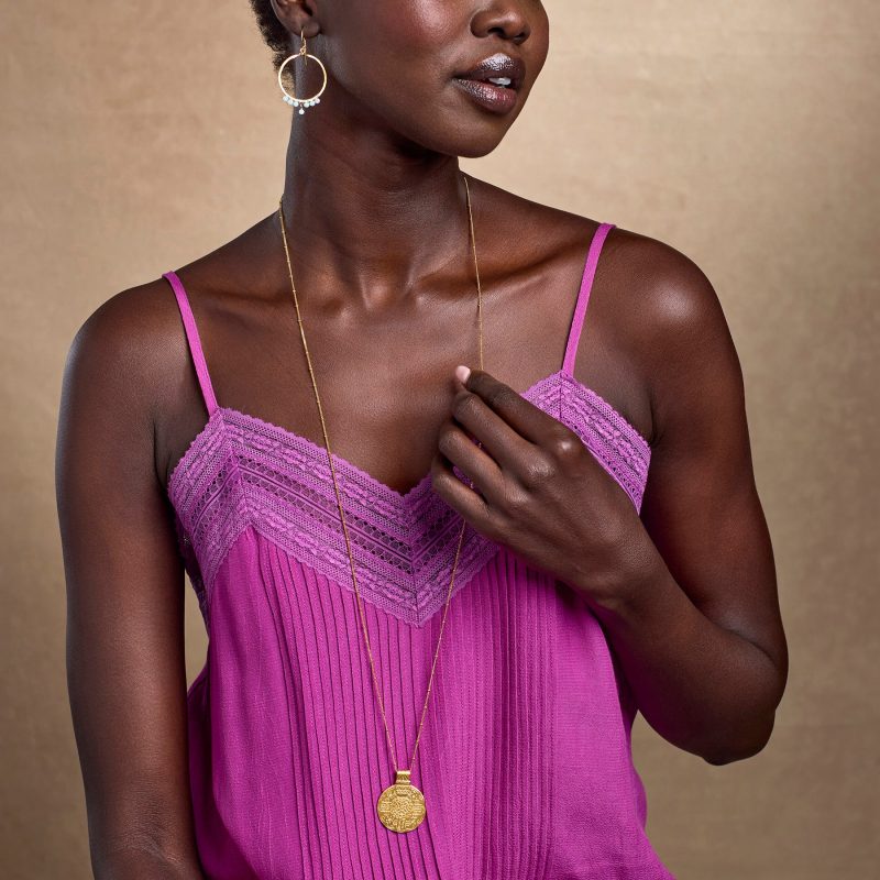 Feel the warmth radiate from out unique. handcrafted medallion in this 22kt gold vermeil necklace. trailing shining beads and reflected light. USA. Exclusive. Approx. 36l