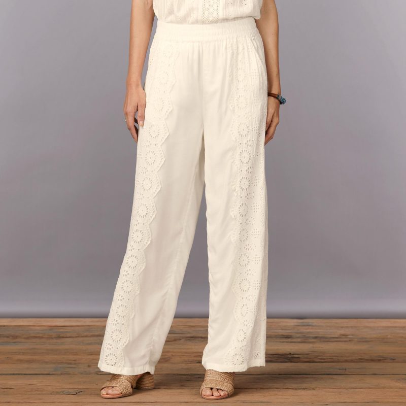 Simply sophisticated. elastic waist. wide-leg pants with feminine side eyelet detail and two pockets. Fully lined. Modal/viscose. Machine wash. Imported. Exclusive. Sizes XXS (00). XS (0?C2). S (4?C6). M (8?C10). L (12?C14). XL (16?C18). 27 inseam.