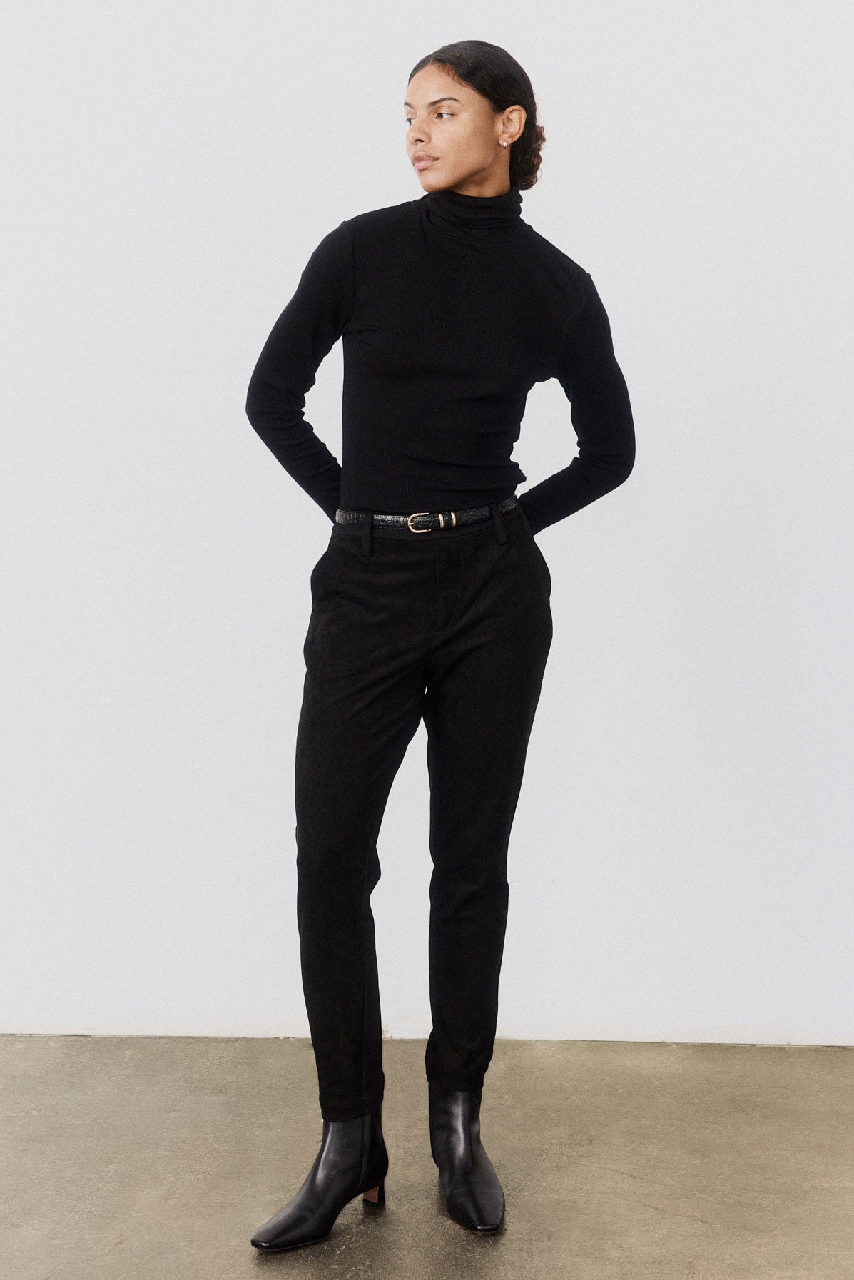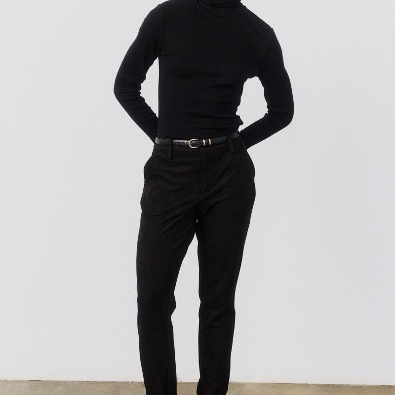 Tailored sophistication meets everyday ease. Cut from supple vegan suede. these trousers combine a structured silhouette with the softest hand-feel. The result is a pant that looks polished yet feels effortless — perfect for dressing up or down through the season.