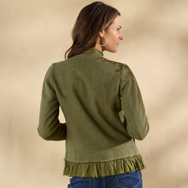 A happy marriage of rugged and refined. our Tonala Floral Blazer blends raw-edged fabric with the ultra-feminine touch of vintage floral embroidery—all wrapped up in a tailored silhouette. Mandarin collar. five-button placket. side pockets and flirty flounce at the hem. Linen/cotton. Machine wash. Imported. Exclusive. Sizes XXS (00). XS (0–2). S (4–6). M (8–10). L (12–14). XL (16–18). Approx. 22l.
