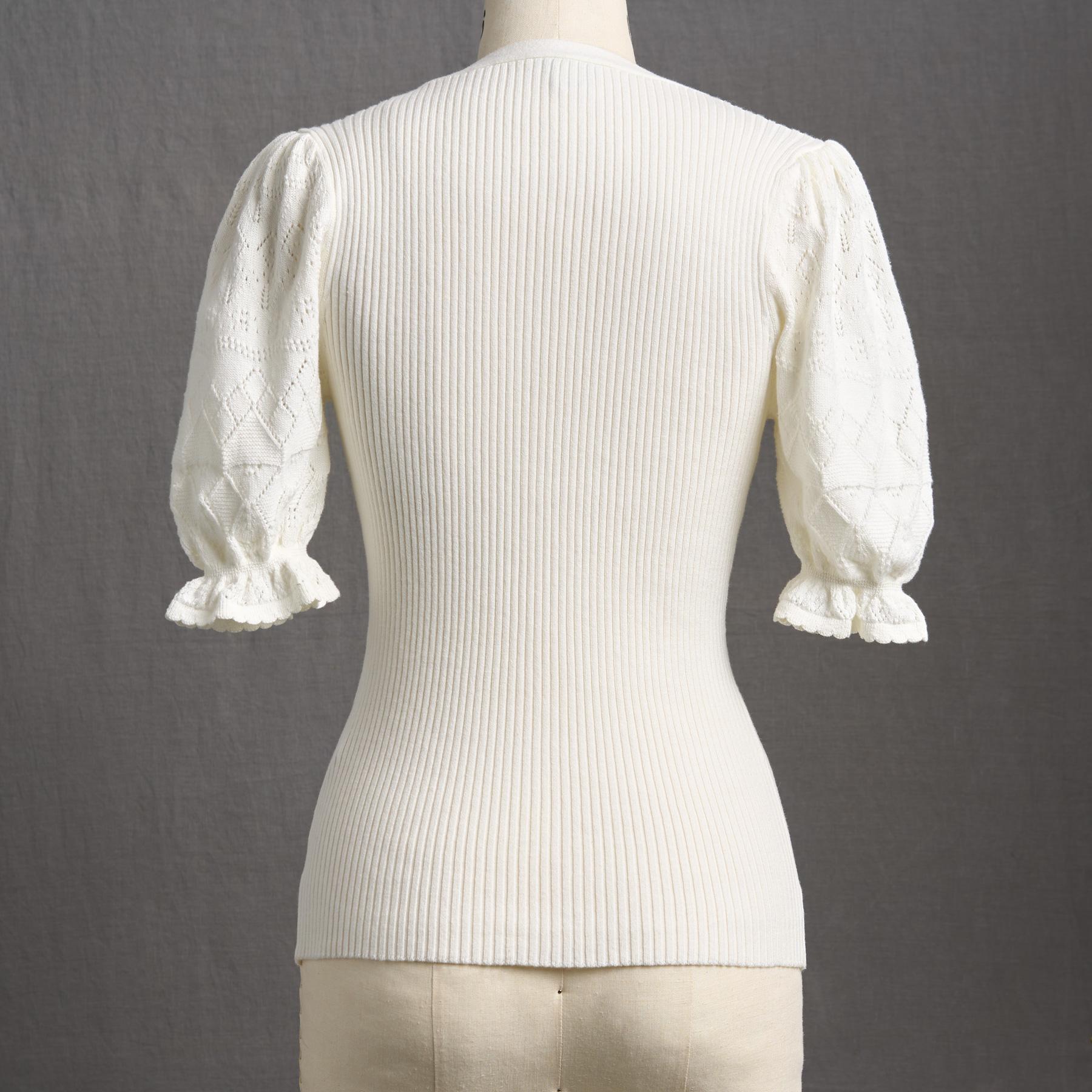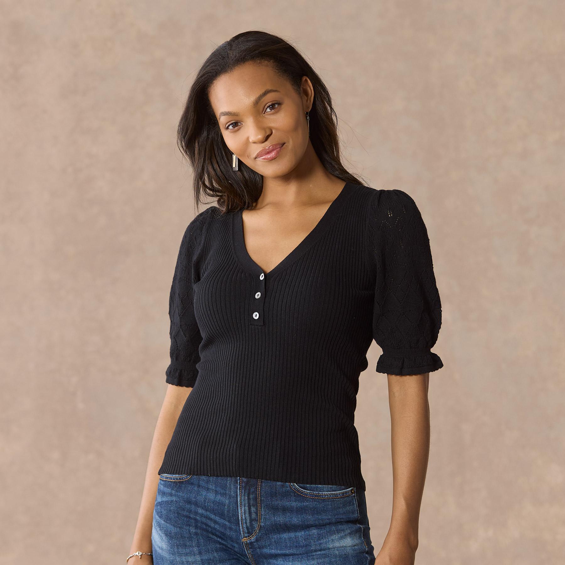 Experience the essence of luxury in our feminine and fitted V-neck henley. so soft in our Legends Lightweight Yarn. Beautiful pointelle at the bold puff sleeves and special scalloped trim details add an extra touch of grace. Organic cotton/nylon/spandex. Machine wash. Imported. Exclusive. Sizes XS (0–2). S (4–6). M (8–10). L (12–14). XL (16–18). XXL (20–22) Approx. 22.5l.