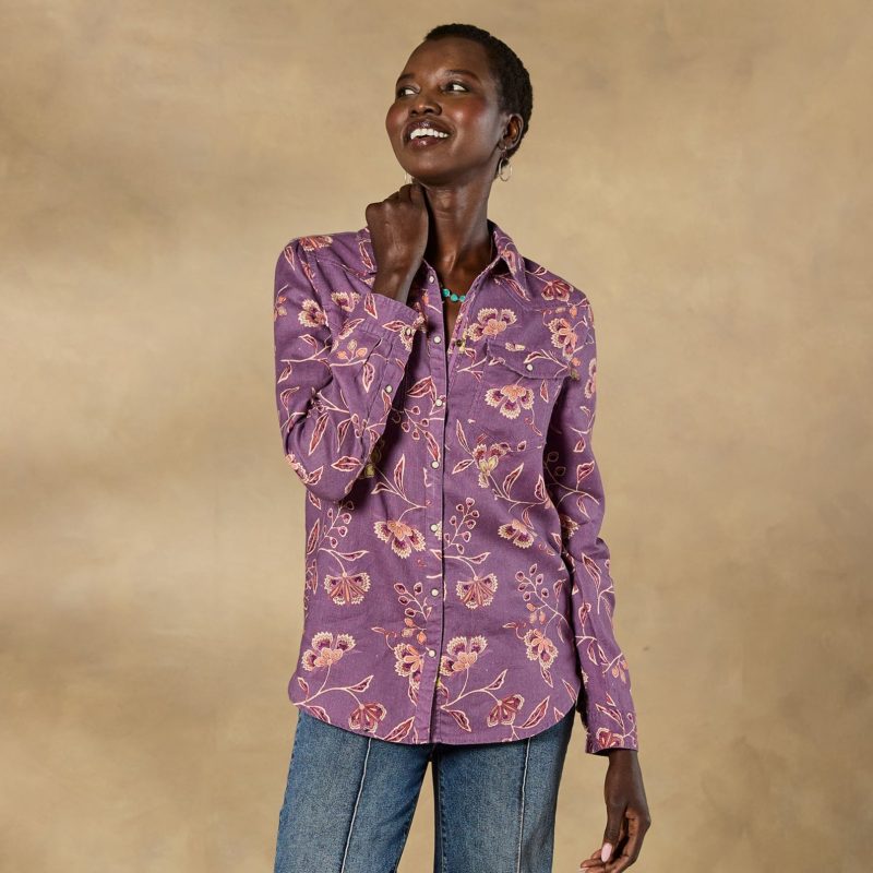 The perfect blend of a classic collared shirt and floral Sundance style—contrast details at the cuff. stand collar and inside placket for a surprising pop of color. Western-inspired yoke and front patch pockets.Hand wash. Imported. Exclusive. Sizes XXS (00). XS (0–2). S (4–6). M (8–10). L (12–14). XL (16–18). Approx. 24.5l.